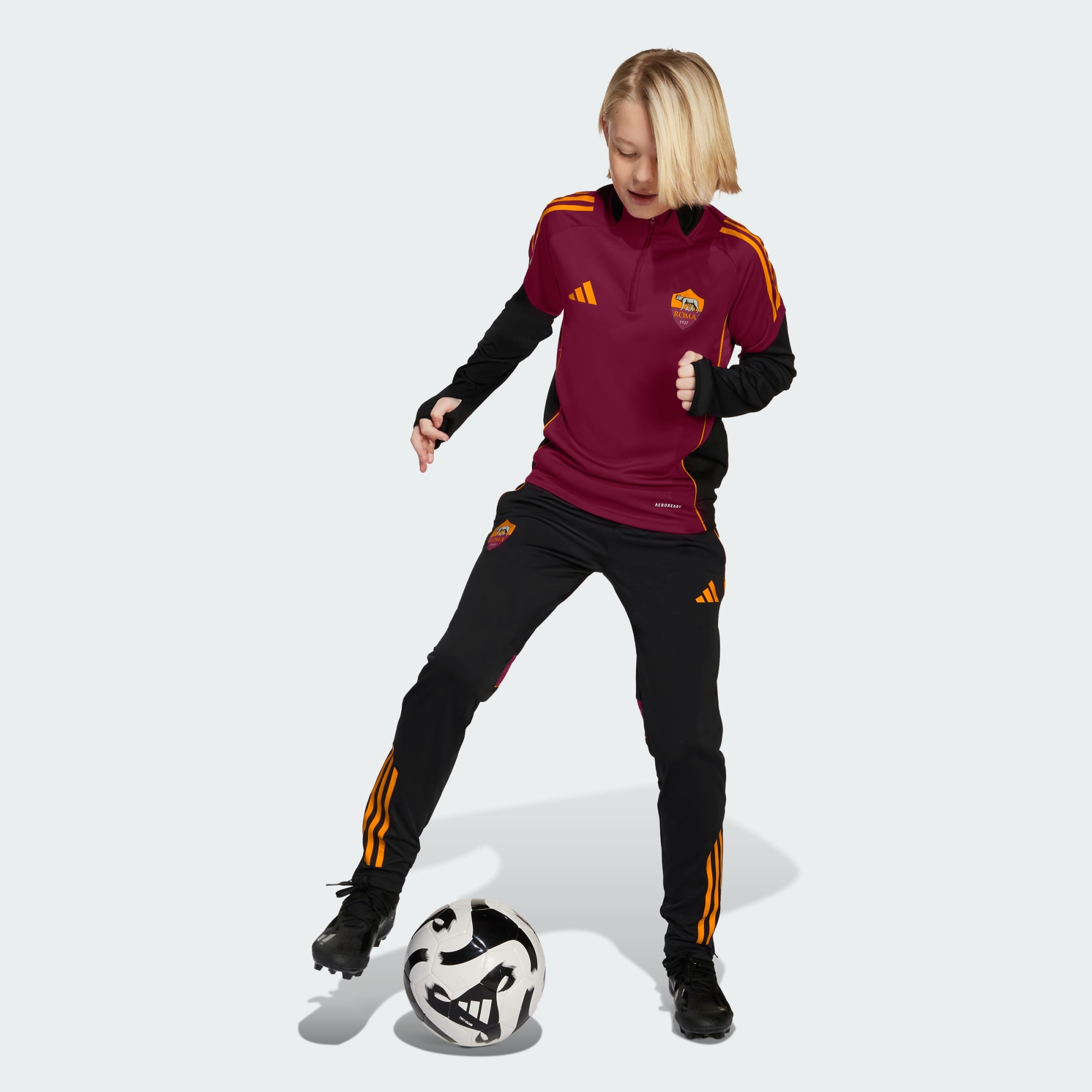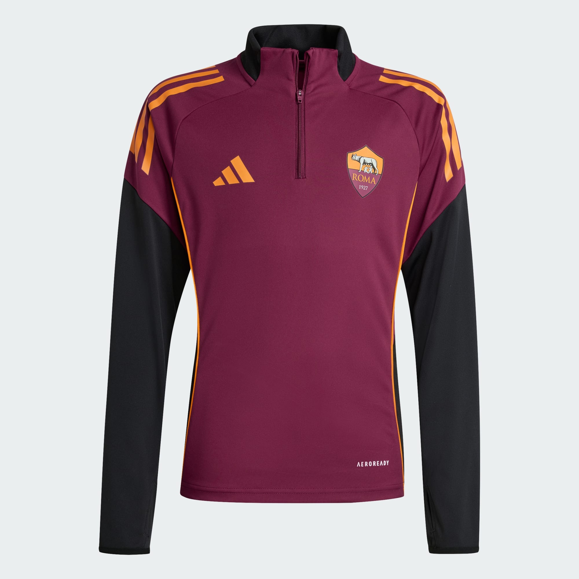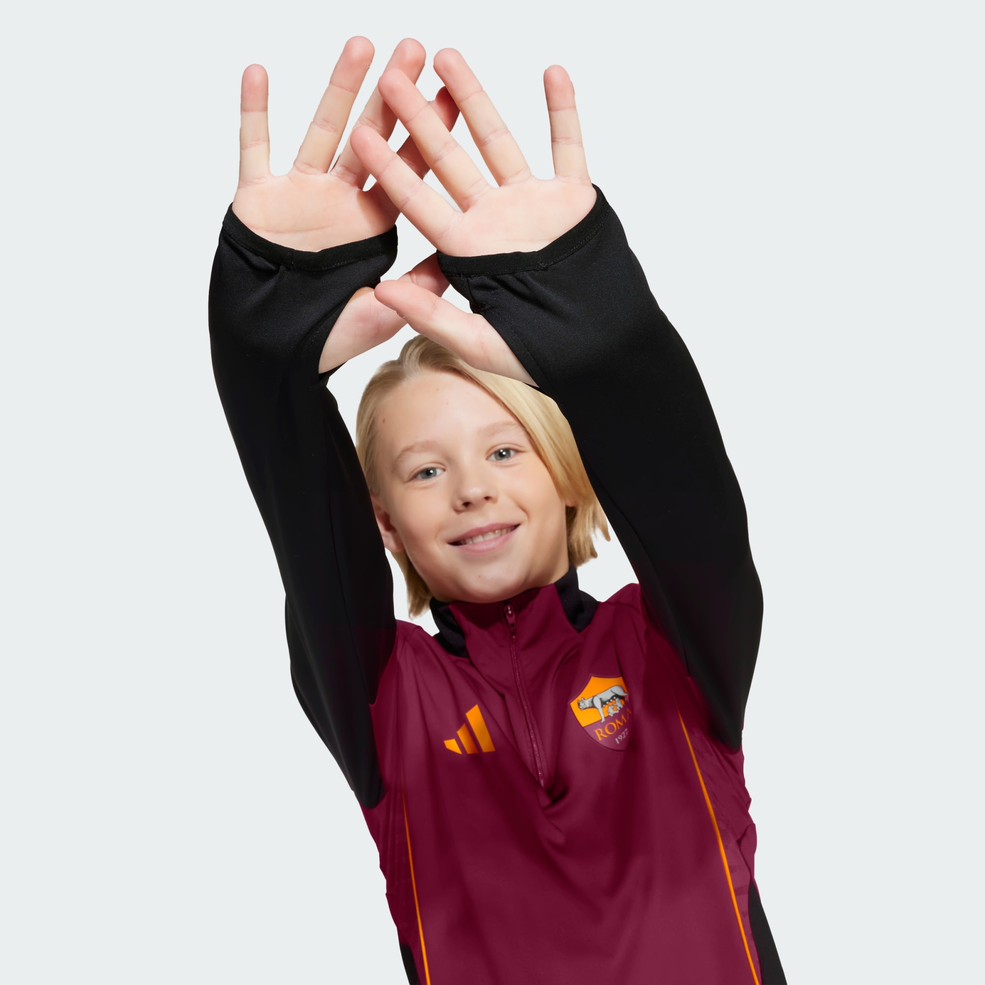 Graj jak mistrz piłki nożnej podczas chłodnych treningów w tej młodzieżowej bluzie treningowej AS Roma Tiro 25 Competition od adidas. Opływowy krój zapewnia dopasowany wygląd, gdy zakładasz ją na koszulkę, a krótki suwak oznacza, że możesz ją błyskawicznie zdjąć. Długie rękawy można naciągnąć na dłonie dzięki otworom na kciuki w mankietach.