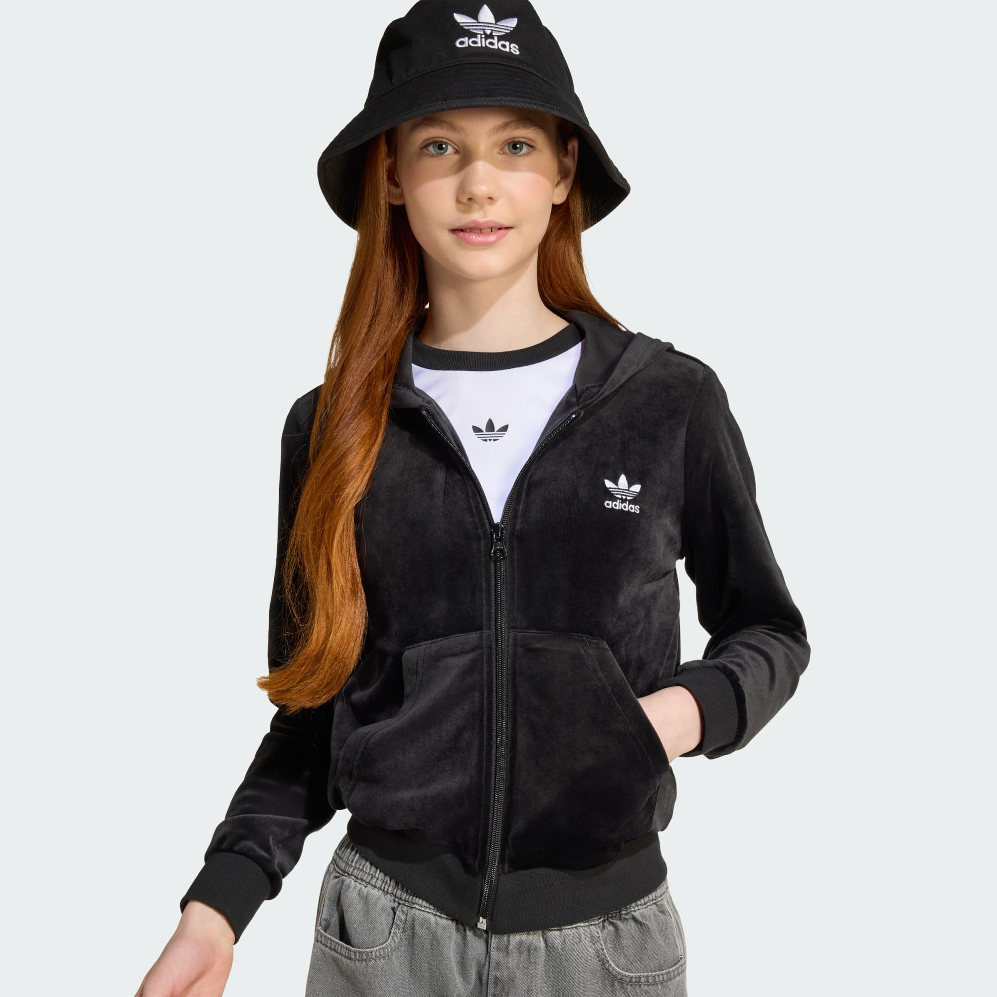 Ta młodzieżowa bluza adidas z kapturem jest tak miękka i wygodna, jak wygląda. Wykonana z pluszowego weluru, idealnie nadaje się do relaksu lub na wyjścia. Dopasowany krój nadaje elegancką sylwetkę. Kultowe logo Trefoil na piersi dodaje sportowego charakteru.