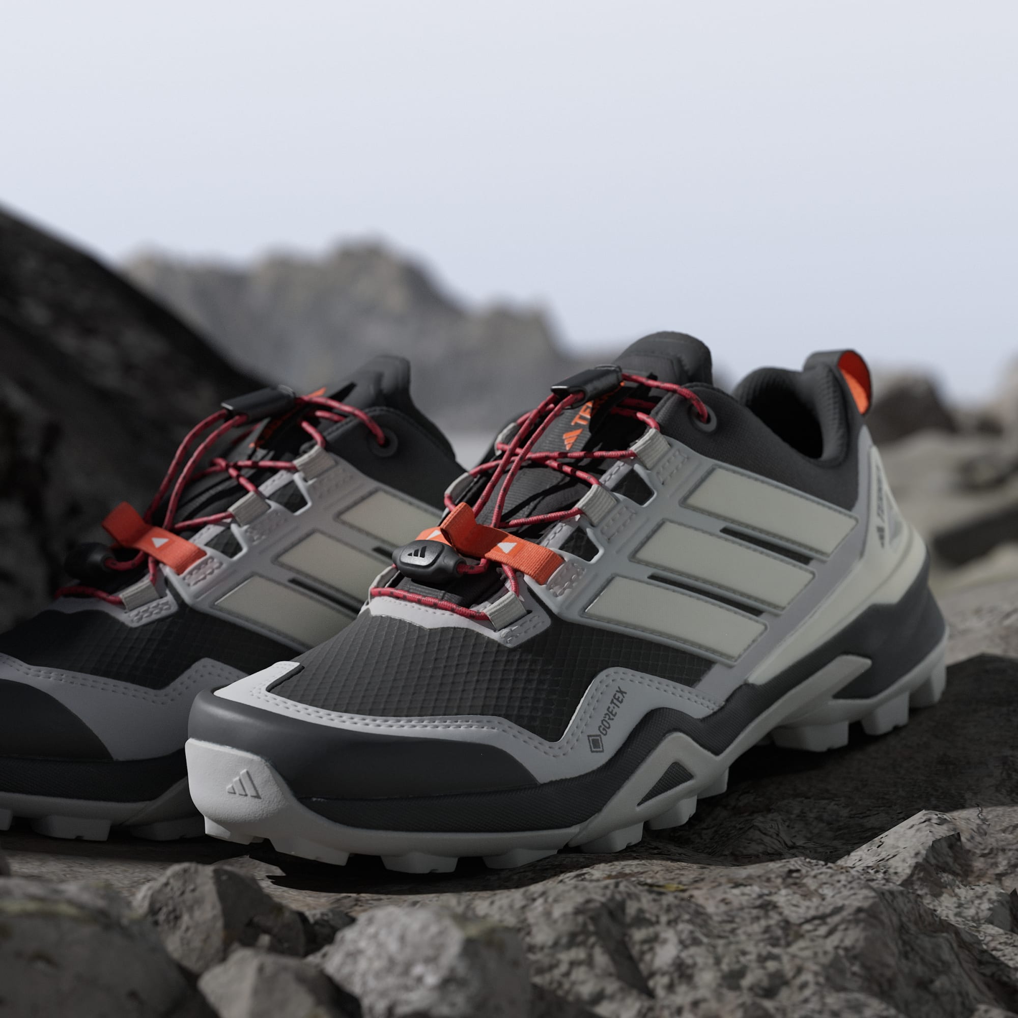 Zbliżenie na czarno-białe buty sportowe z wyróżniającym się logo GORE-TEX na czerwono-pomarańczowym tle.