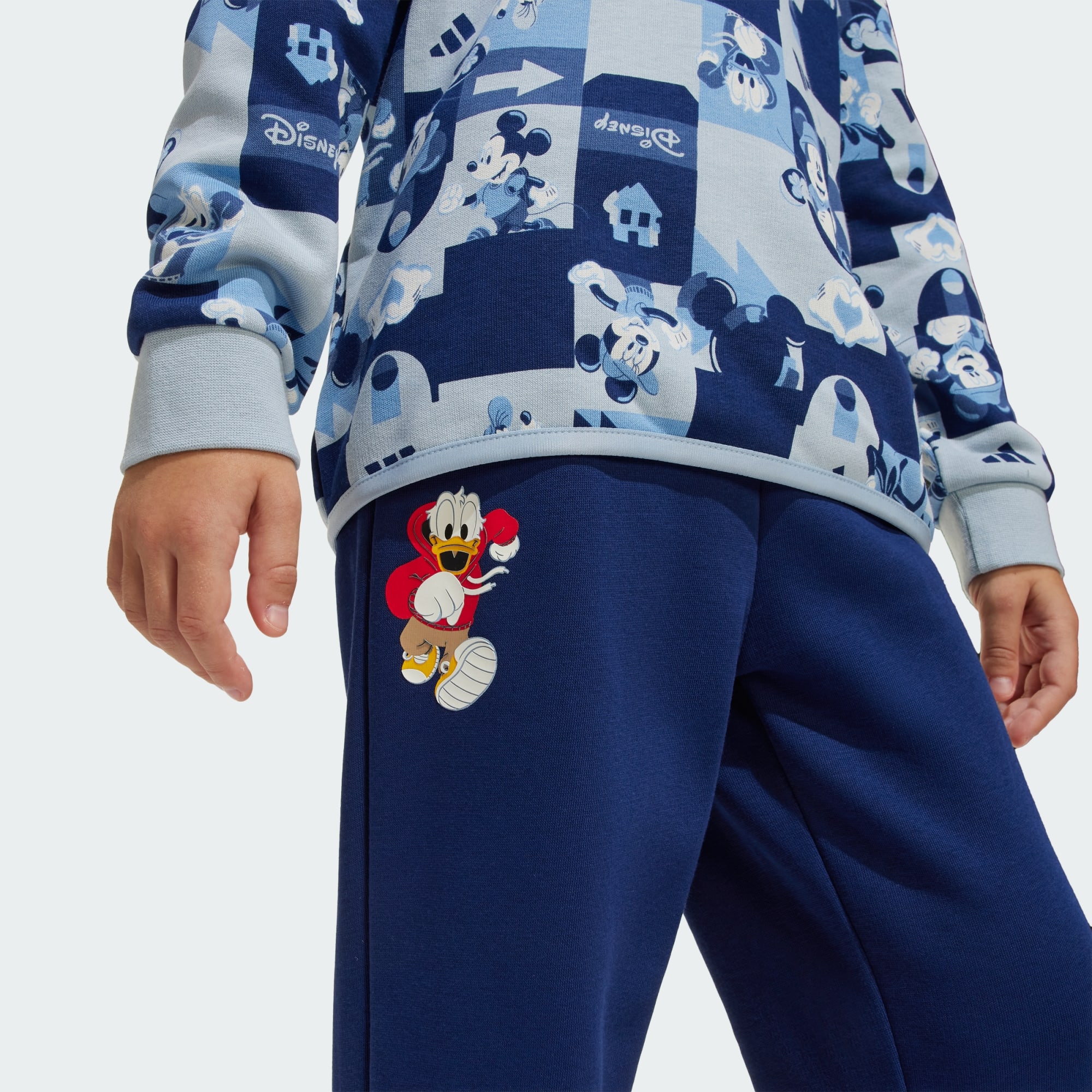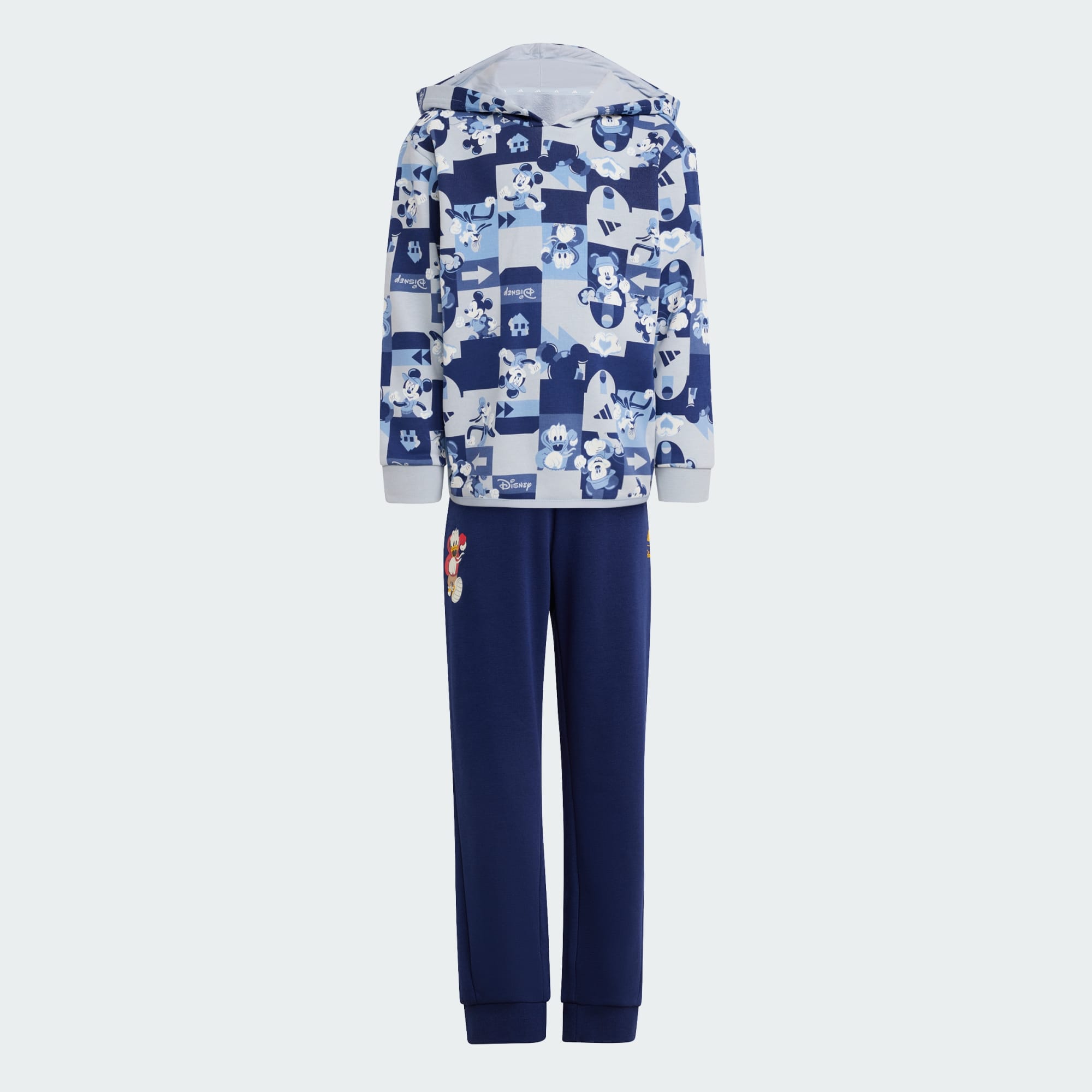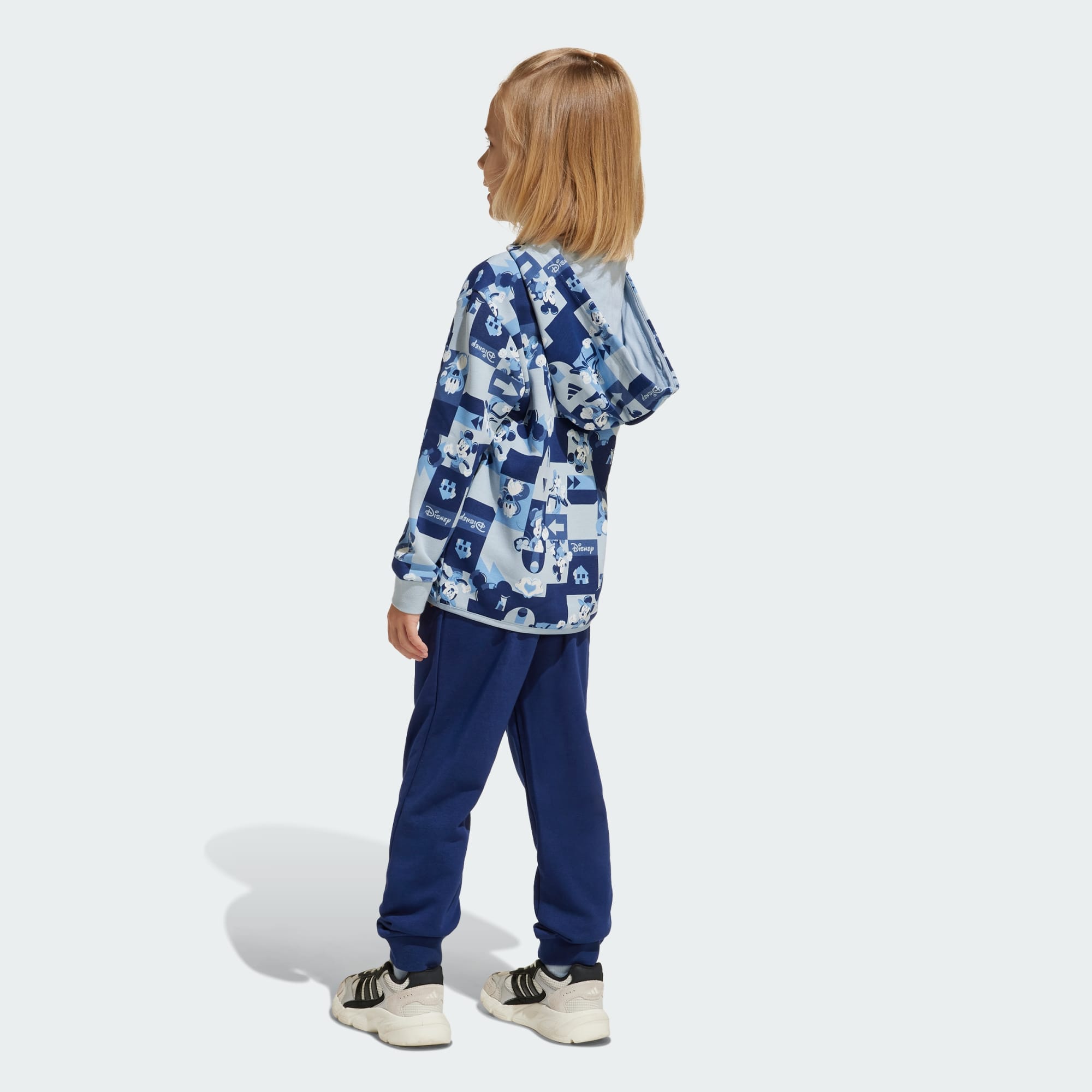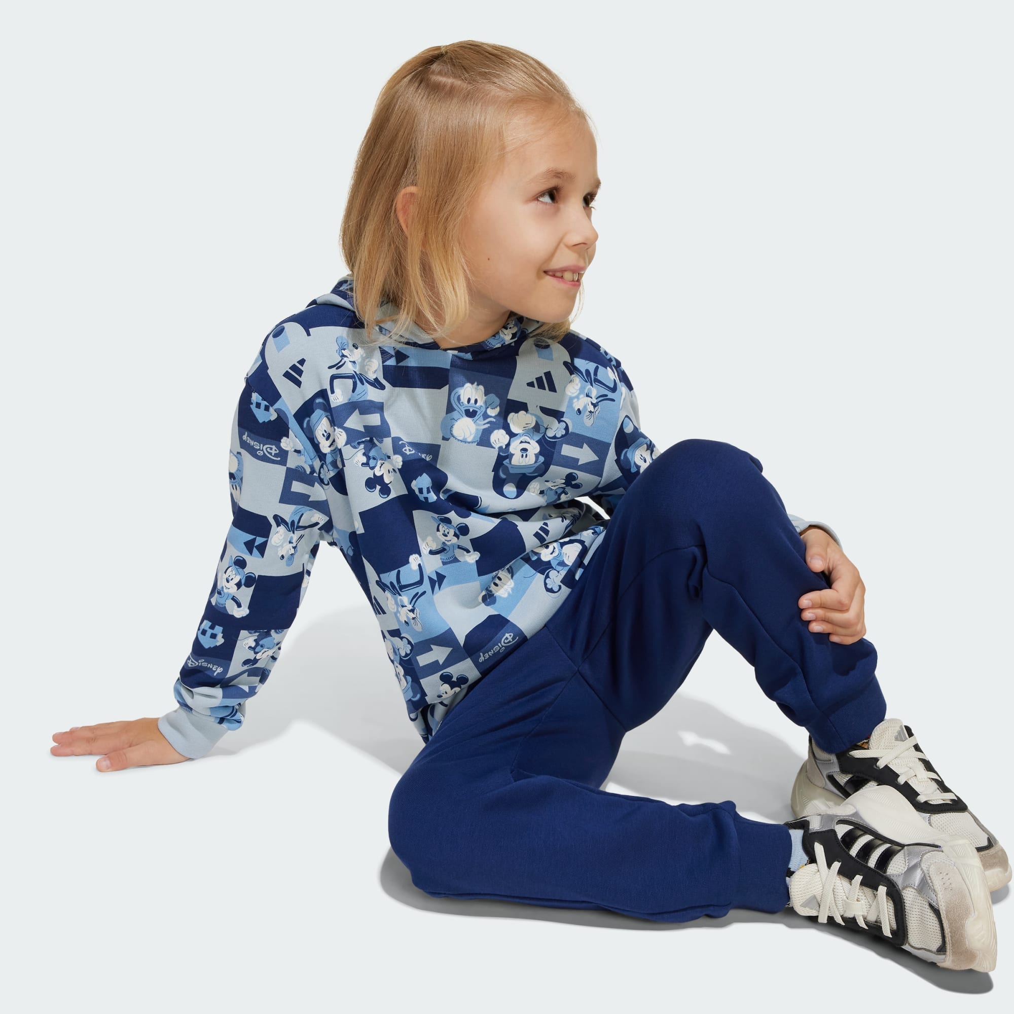 Ten zestaw dresowy dla dzieci od adidas powstał, aby dotrzymać kroku aktywnym dzieciom w ruchu. Luźna bluza z kapturem w połączeniu z pasującymi spodniami dresowymi tworzy wyjątkowo wygodny look od stóp do głów. Grafika z disnejowską Myszką Mickey i przyjaciółmi wnosi zabawny akcent.
