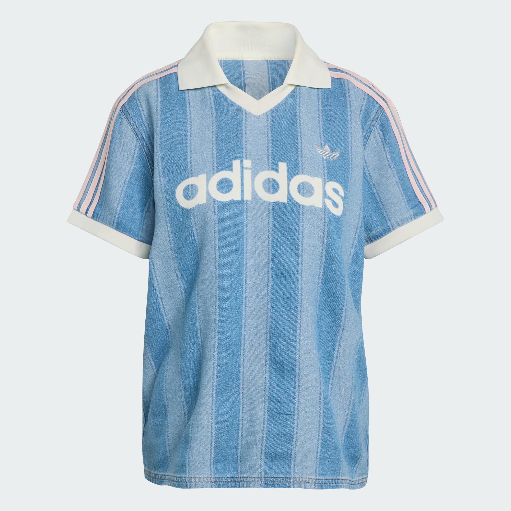 Luźna koszulka piłkarska z dżinsu z dekoltem w kształcie litery V o klasycznym charakterze.