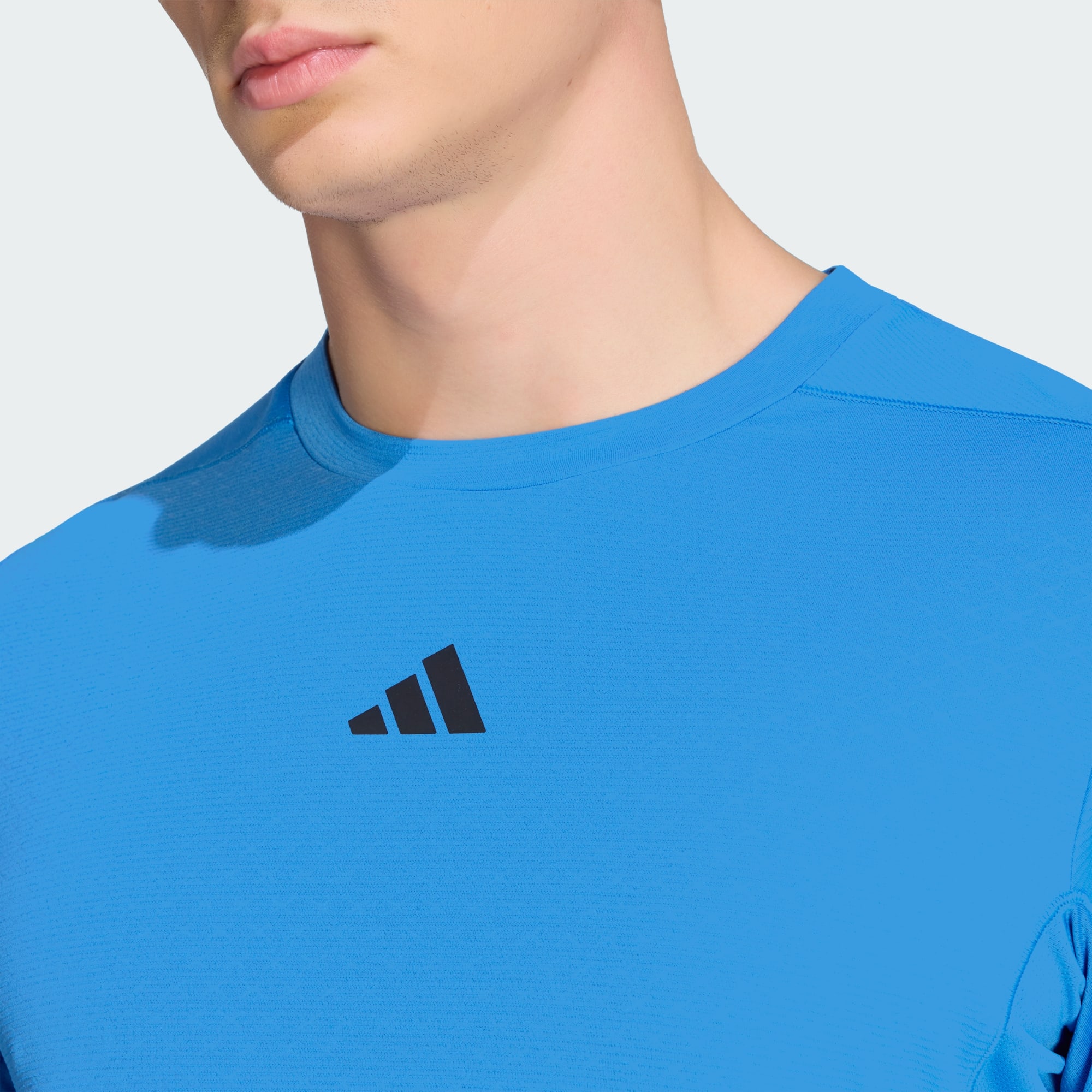 Czarna, sportowa koszulka z teksturowanym wzorem i logo adidas jest widoczna na pierwszym planie, na zwykłym, białym tle.