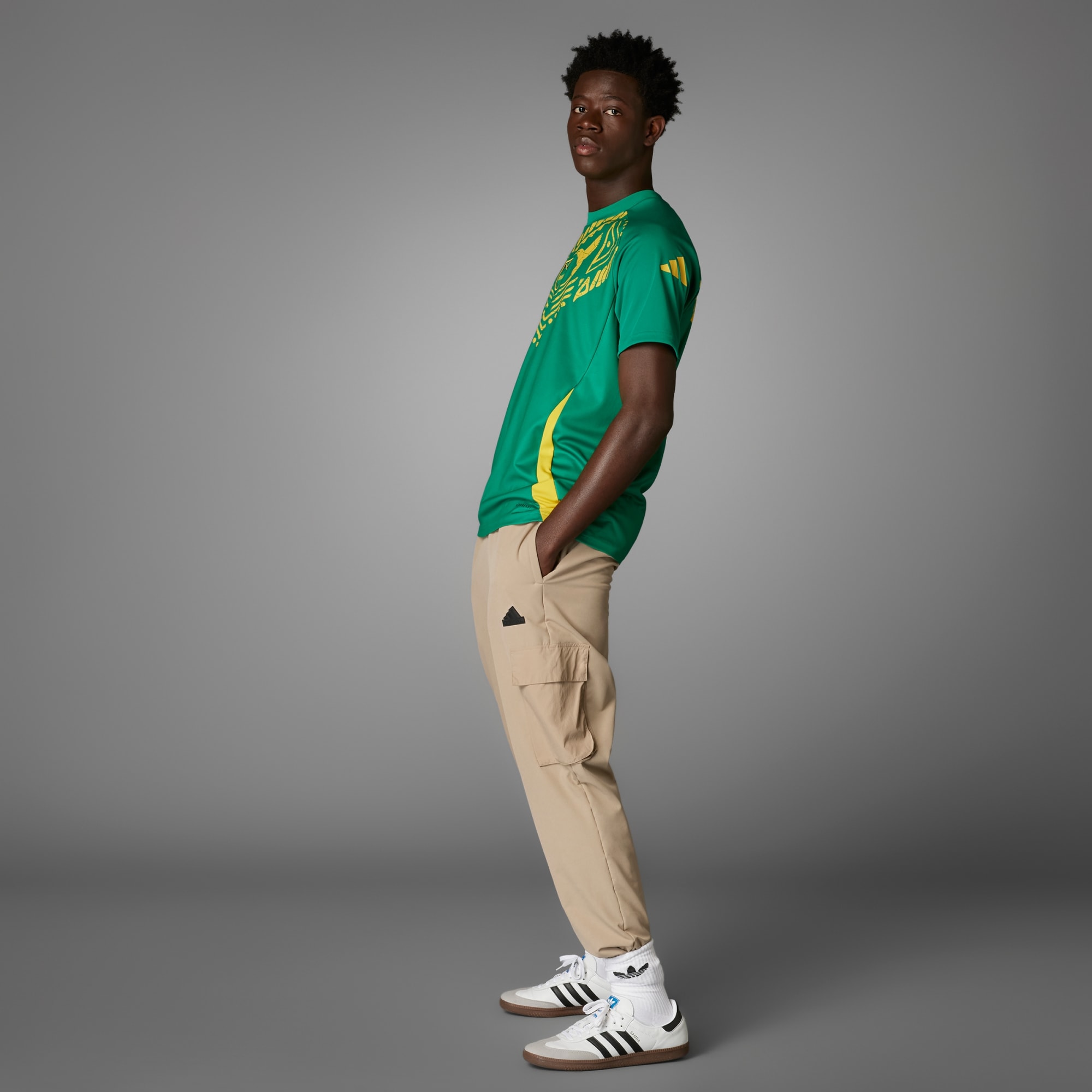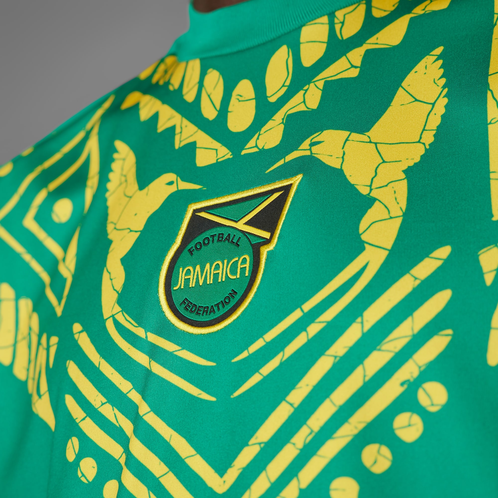 Koszulka rozgrzewkowa reprezentacji Jamajki, która zapożycza look od koszulki meczowej, uszyta z materiałów pochodzących z recyklingu.