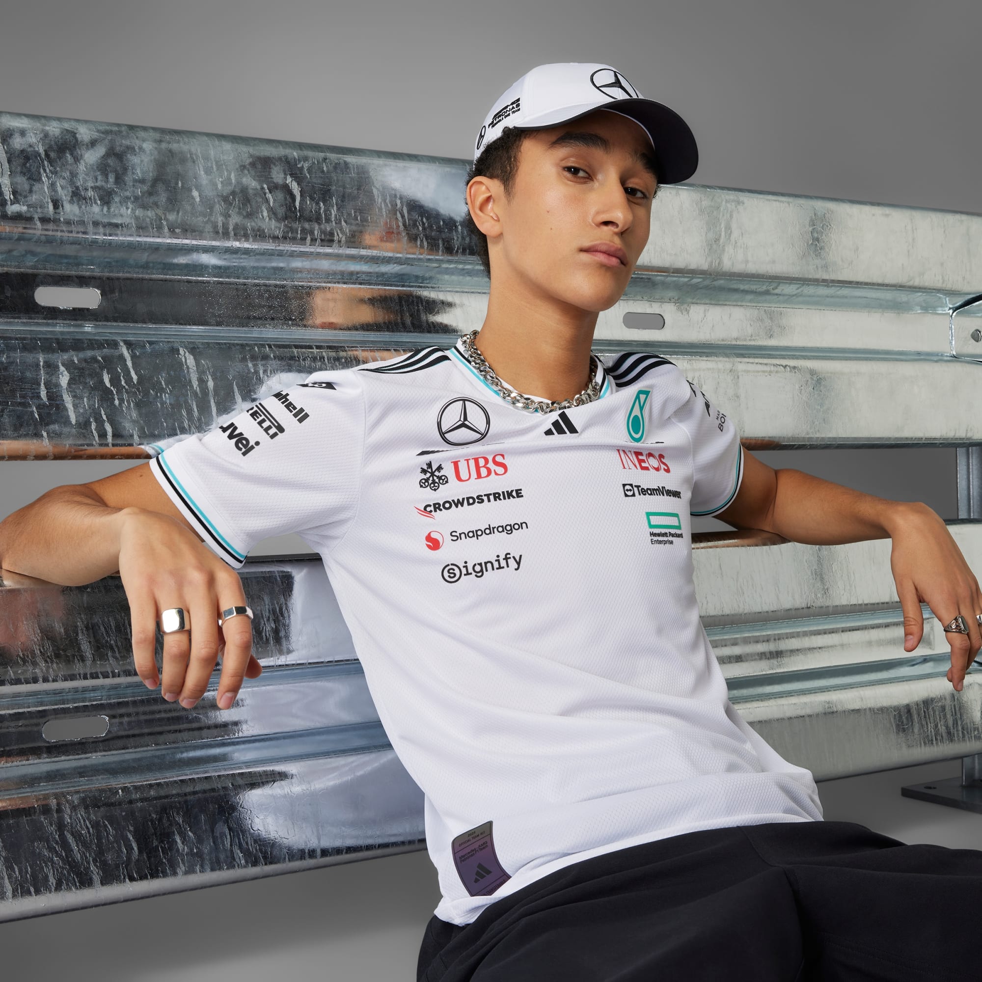 Zanurz się w energię i styl pit stopu w oryginalnej koszulce adidas x Mercedes-AMG PETRONAS F1 noszonej przez kierowców.