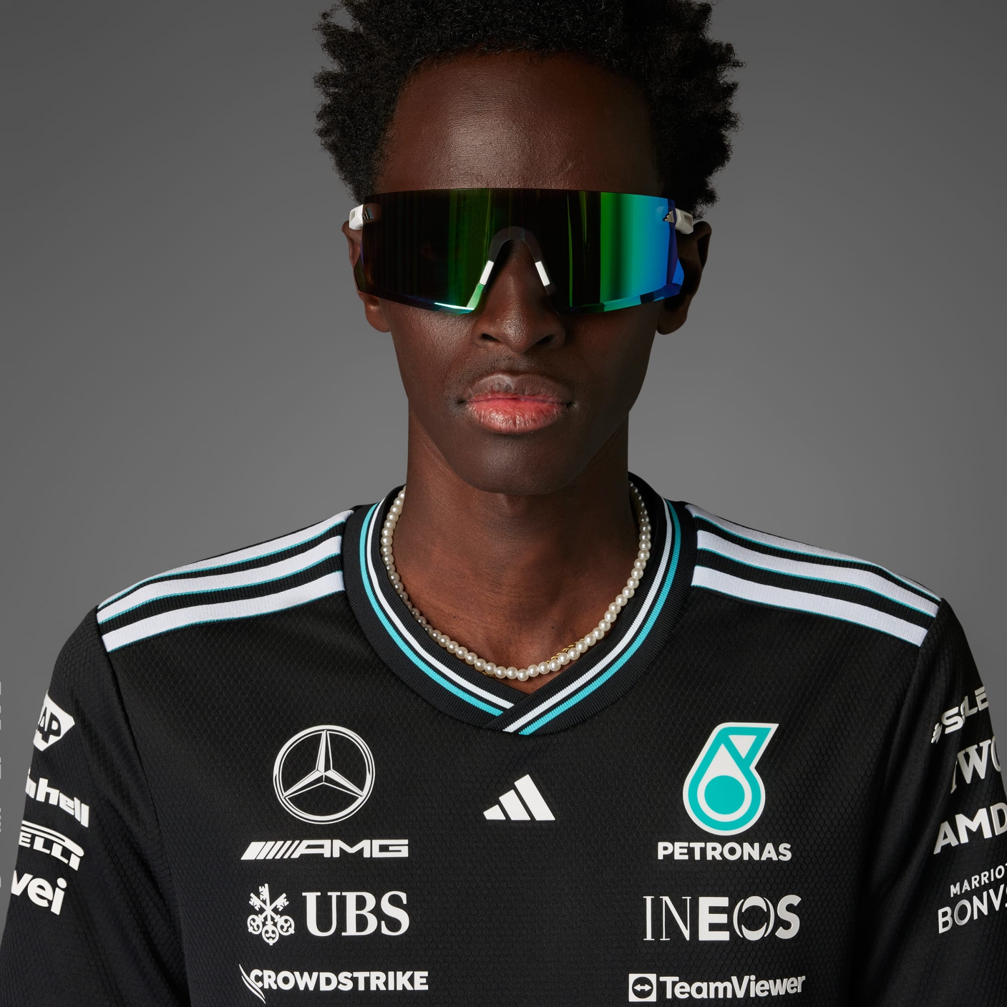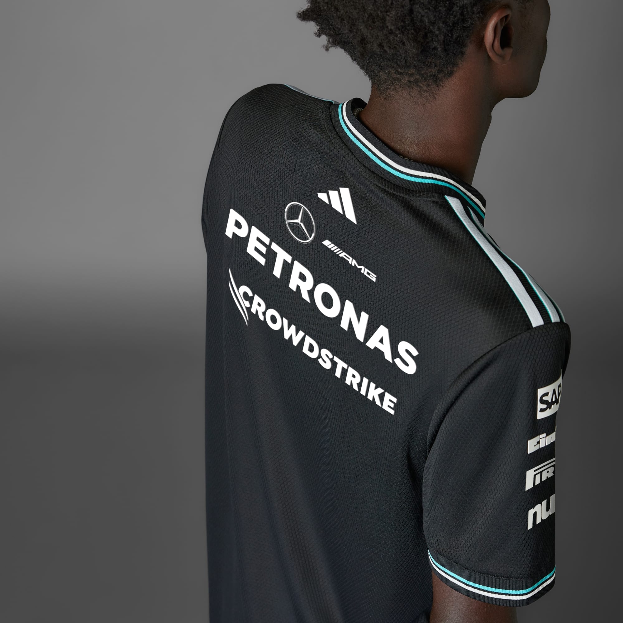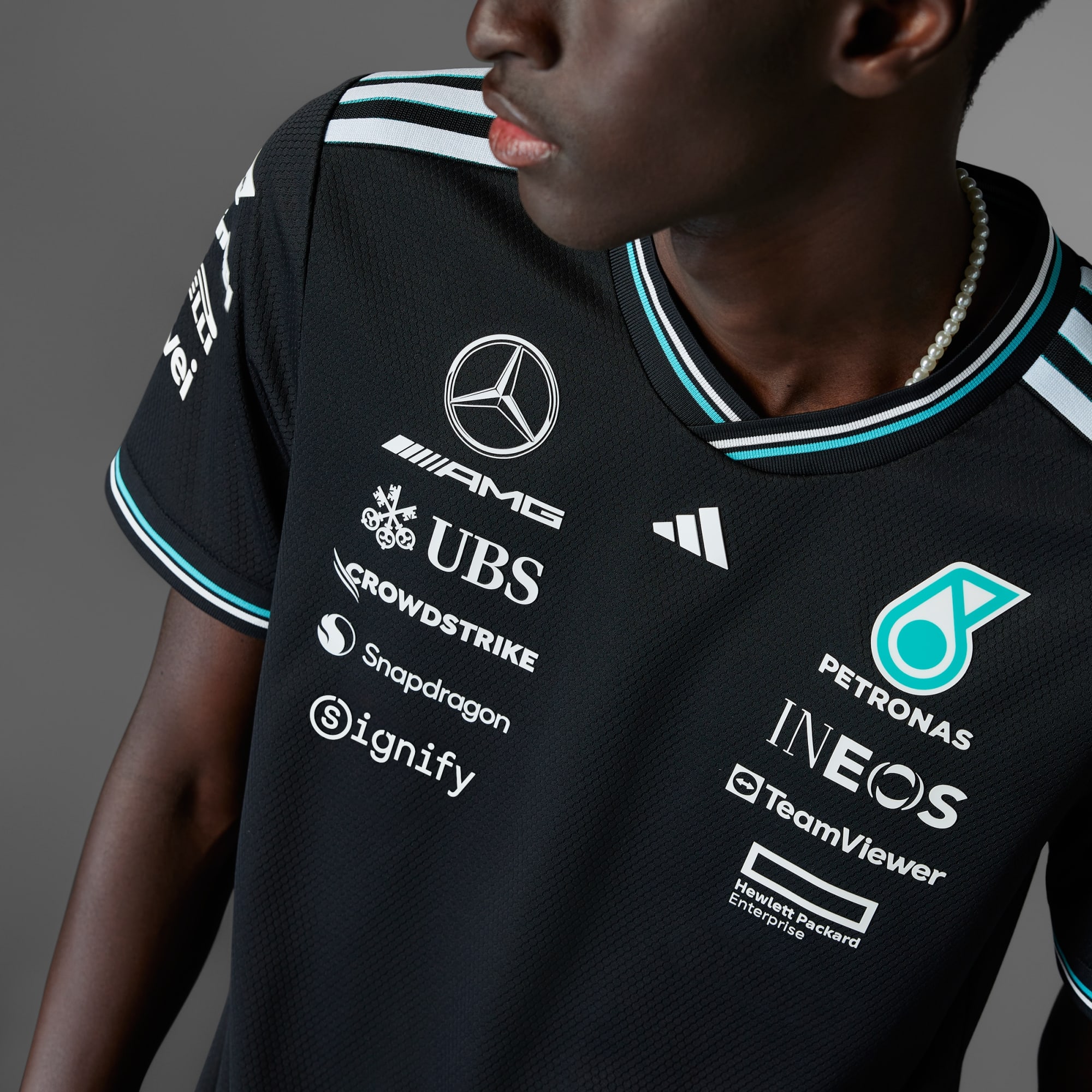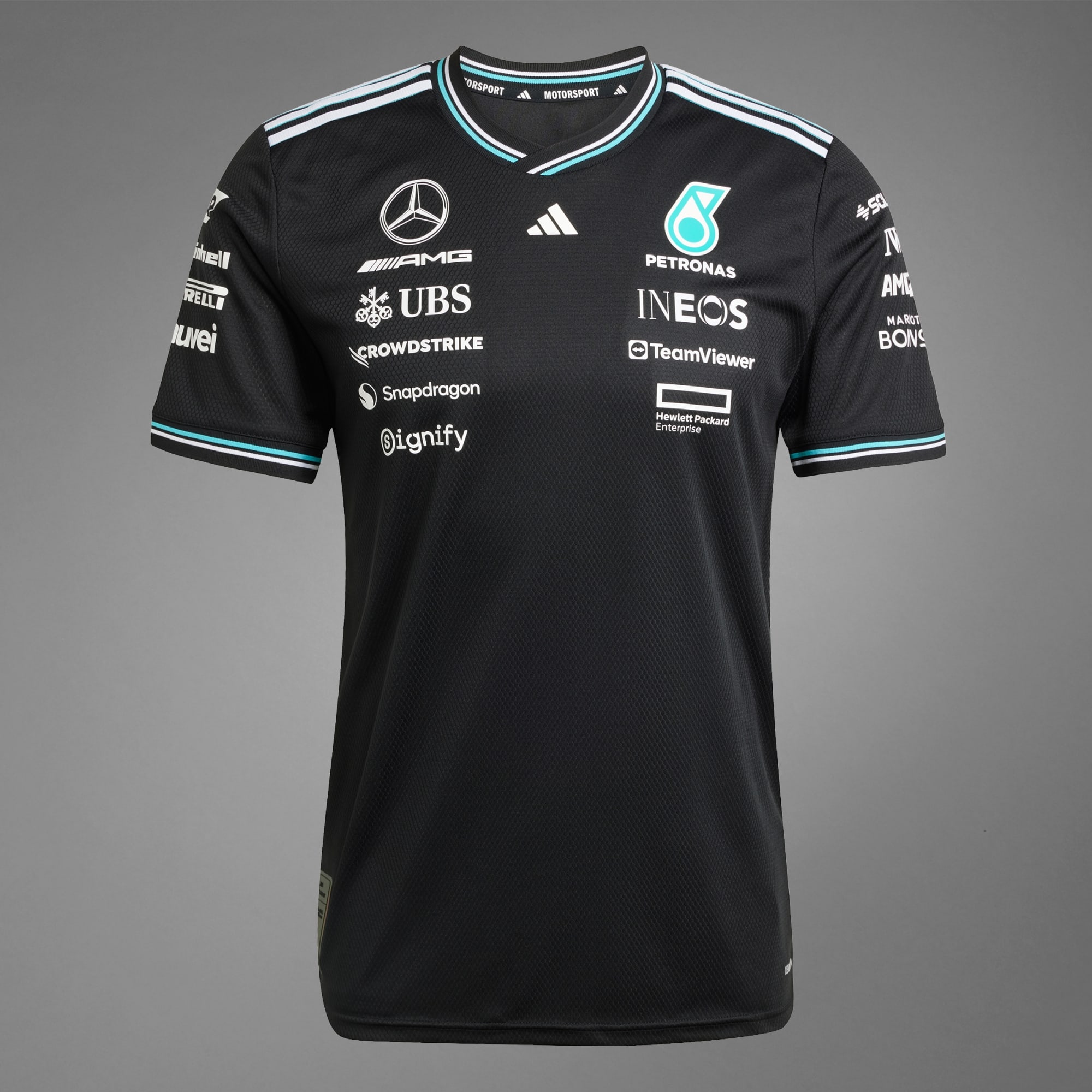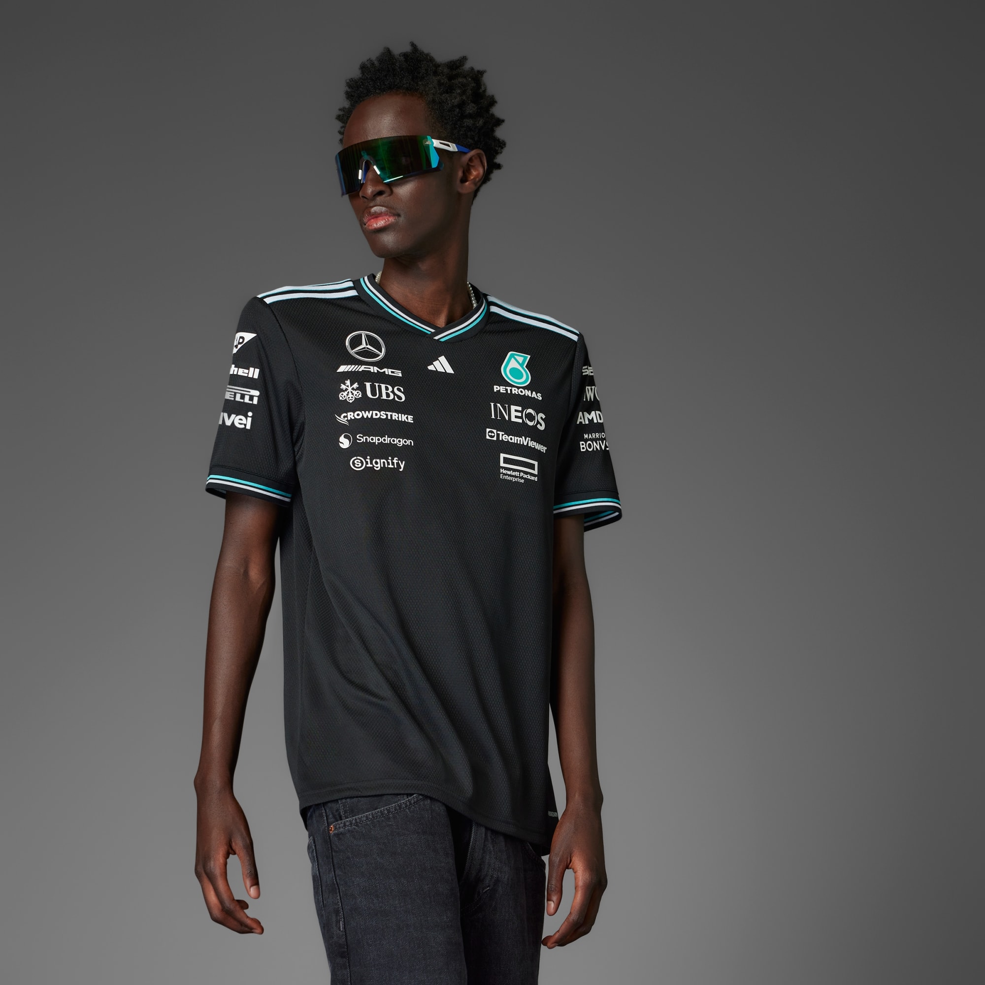 Zanurz się w energię i styl pit stopu w oryginalnej koszulce adidas x Mercedes-AMG PETRONAS F1 noszonej przez kierowców.