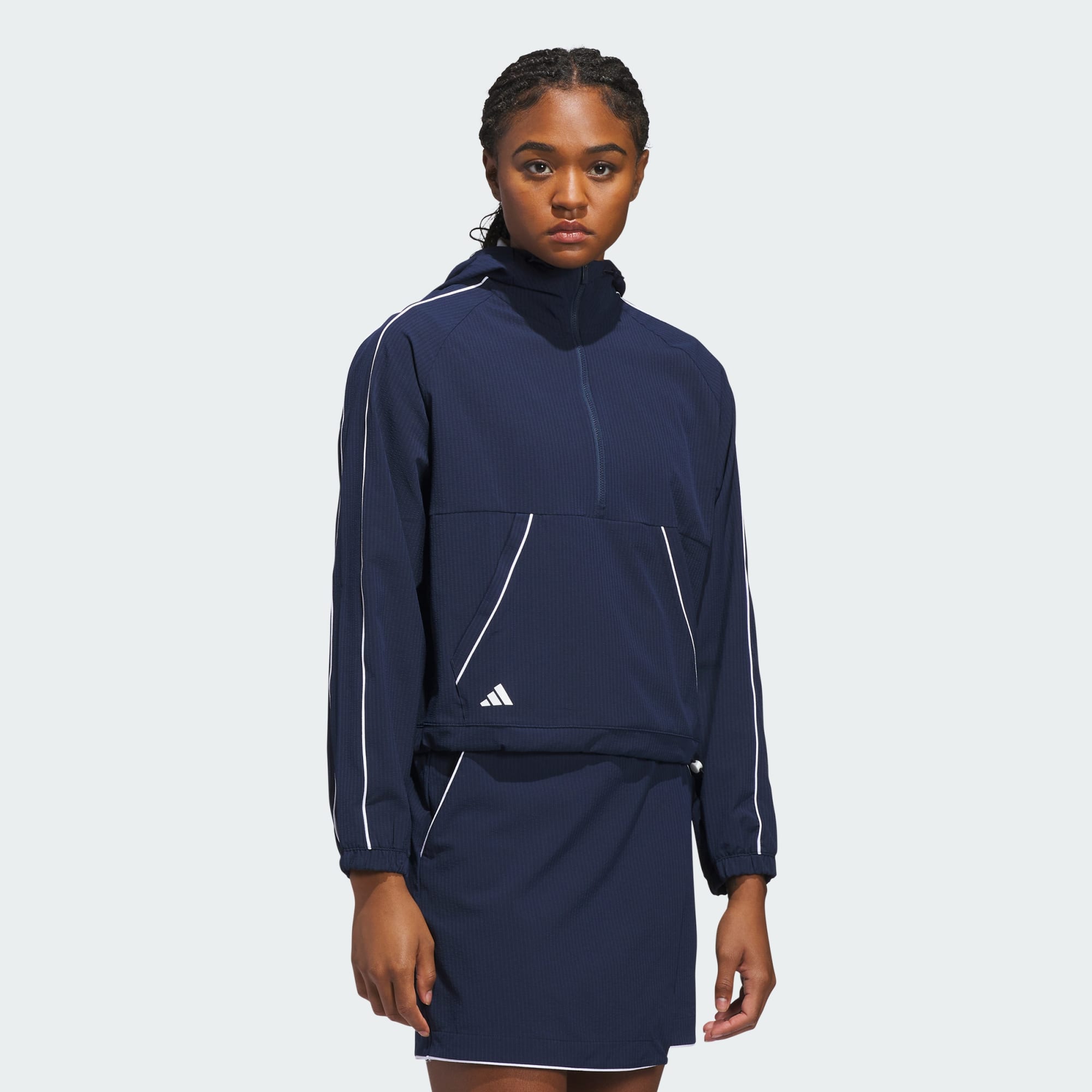 Lekka kurtka golfowa o luźnym kroju z dopasowanym kapturem dla ciepła.