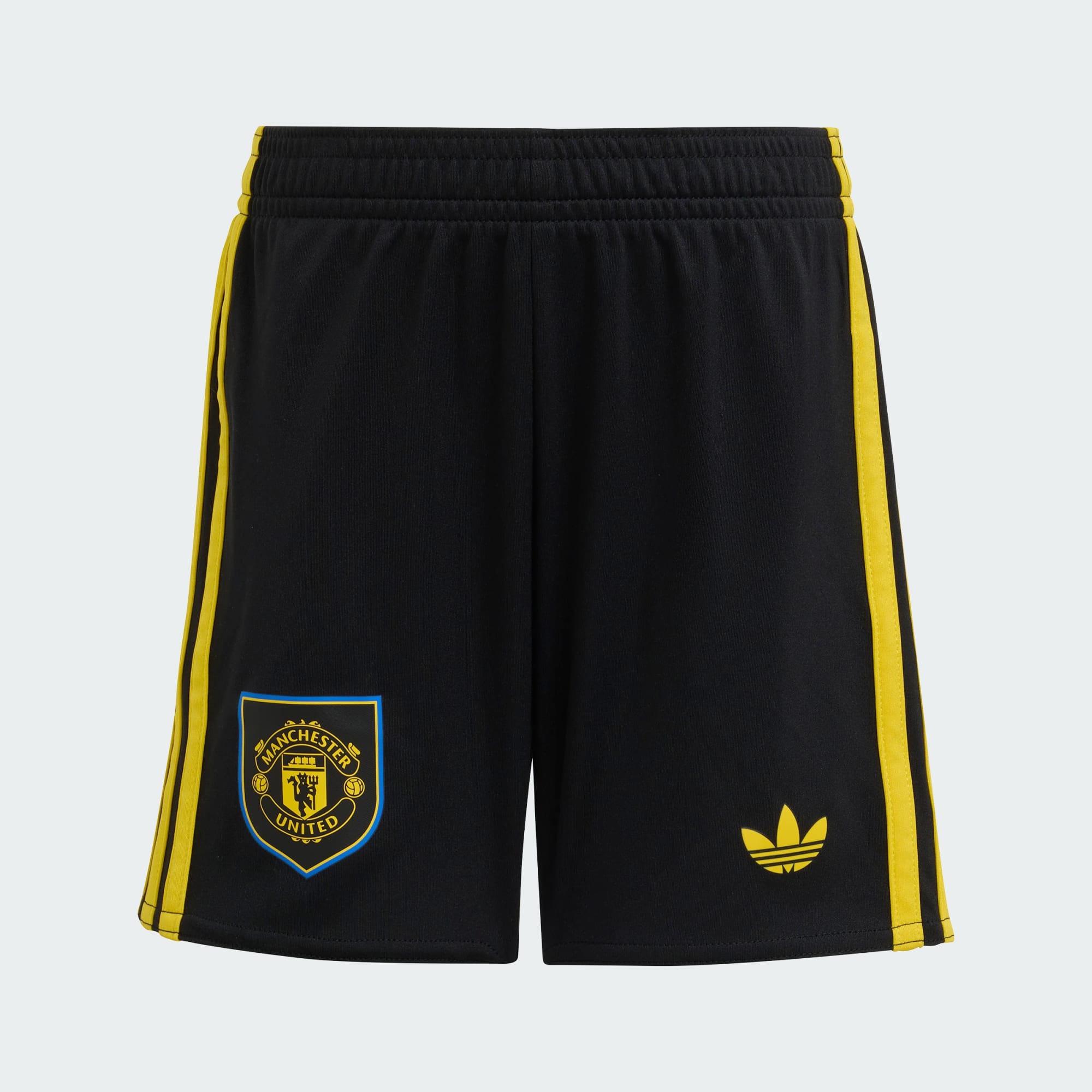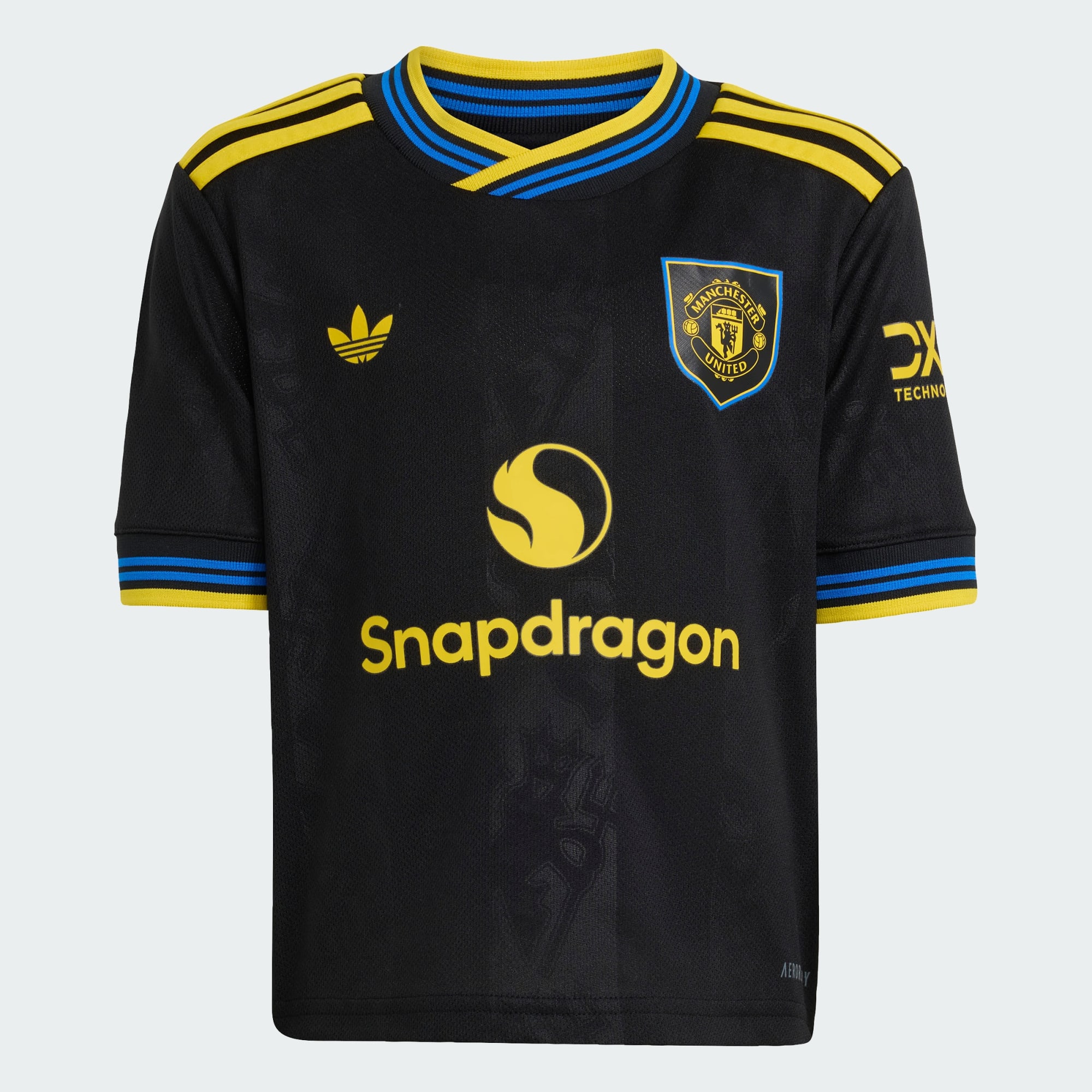 To dziecięca wersja zestawu adidas inspirowanego klasyką, w którym Manchester United gra na wyjazdach. Utrzymany w czarnej kolorystyce, zestaw koszulki i szortów zawiera żółte logotypy Trefoil i naszywki klubu, a subtelniejsze detale zostały wplecione w tkaninę. Technologia AEROREADY odprowadzająca wilgoć zapewnia suchość i pewność siebie podczas każdej piłkarskiej przygody.