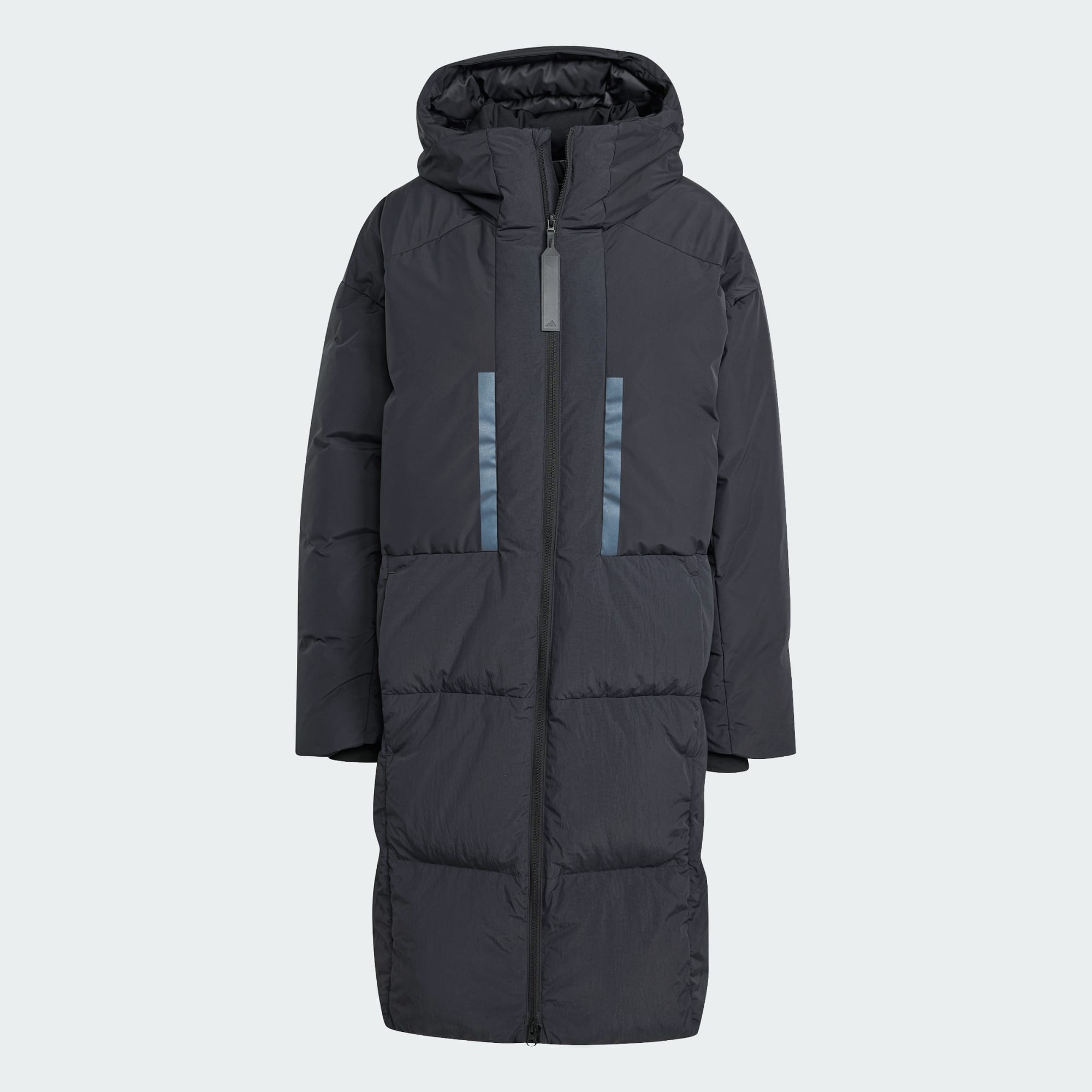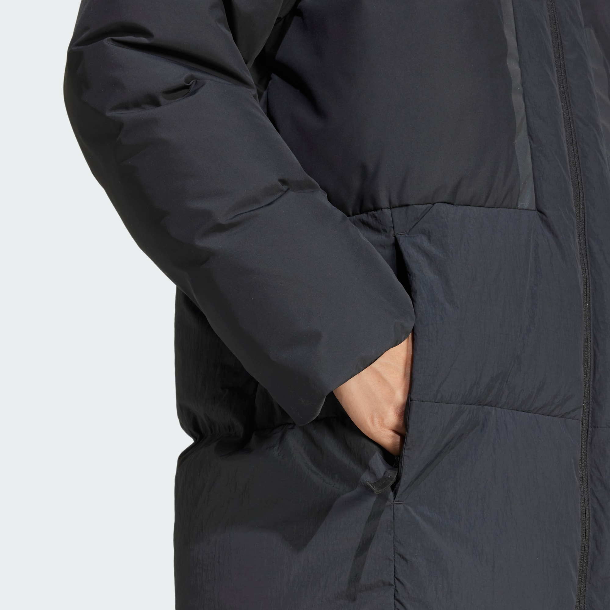 Długa, puchowa parka wykonana z materiałów pochodzących z recyklingu.