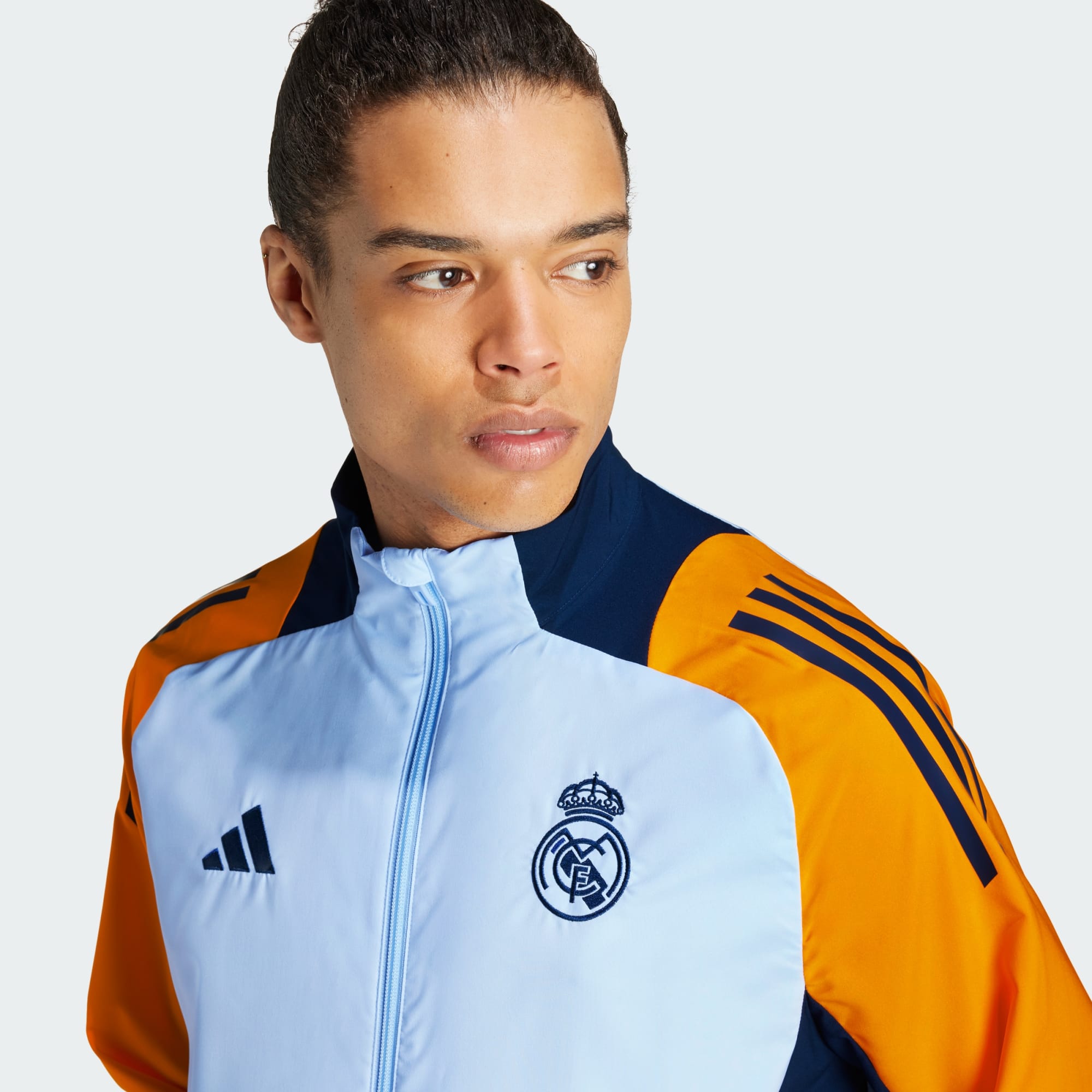 Display your team pride in an adidas Real Madrid jacket designed for players to show unity off the pitch. AEROREADY helps you stay focused and dry while you're representing Los Blancos. Standing out from vibrant colours borrowed from the away jersey, a heat-applied club crest shows your preference for first-class football.This product is made with at least 70% recycled materials. By reusing materials that have already been created, we help to reduce waste and our reliance on finite resources and reduce the footprint of the products we make.