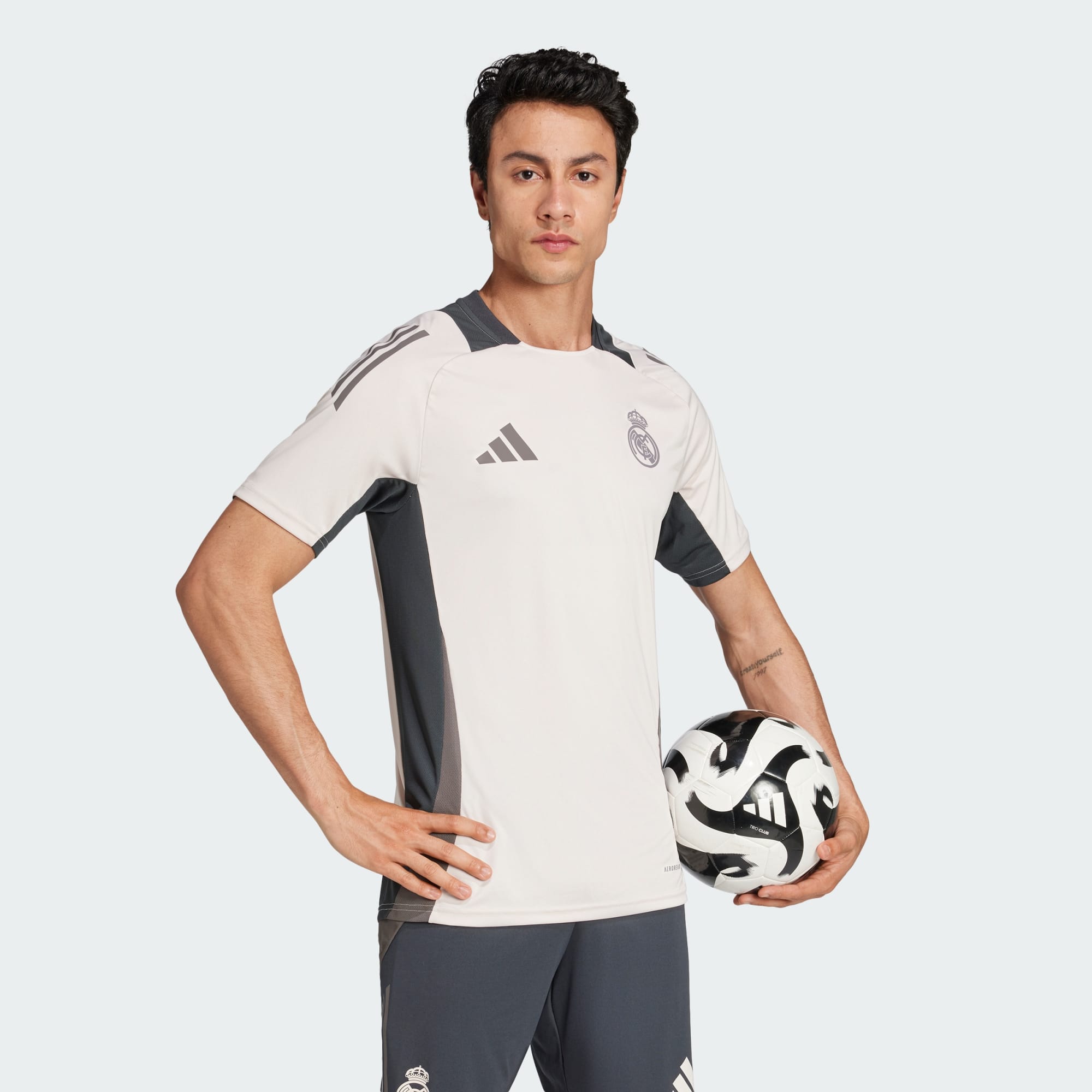 Train like European football titans in the adidas jersey Real Madrid players wear before their biggest matches. Made for focused preparation, this shirt keeps top athletes dry during intensive workouts thanks to AEROREADY technology. Standing out from third jersey-inspired colours, a heat-applied badge supplies all the inspiration you need. This product is made with 100% recycled materials. By reusing materials that have already been created, we help to reduce waste and our reliance on finite resources and reduce the footprint of the products we make.