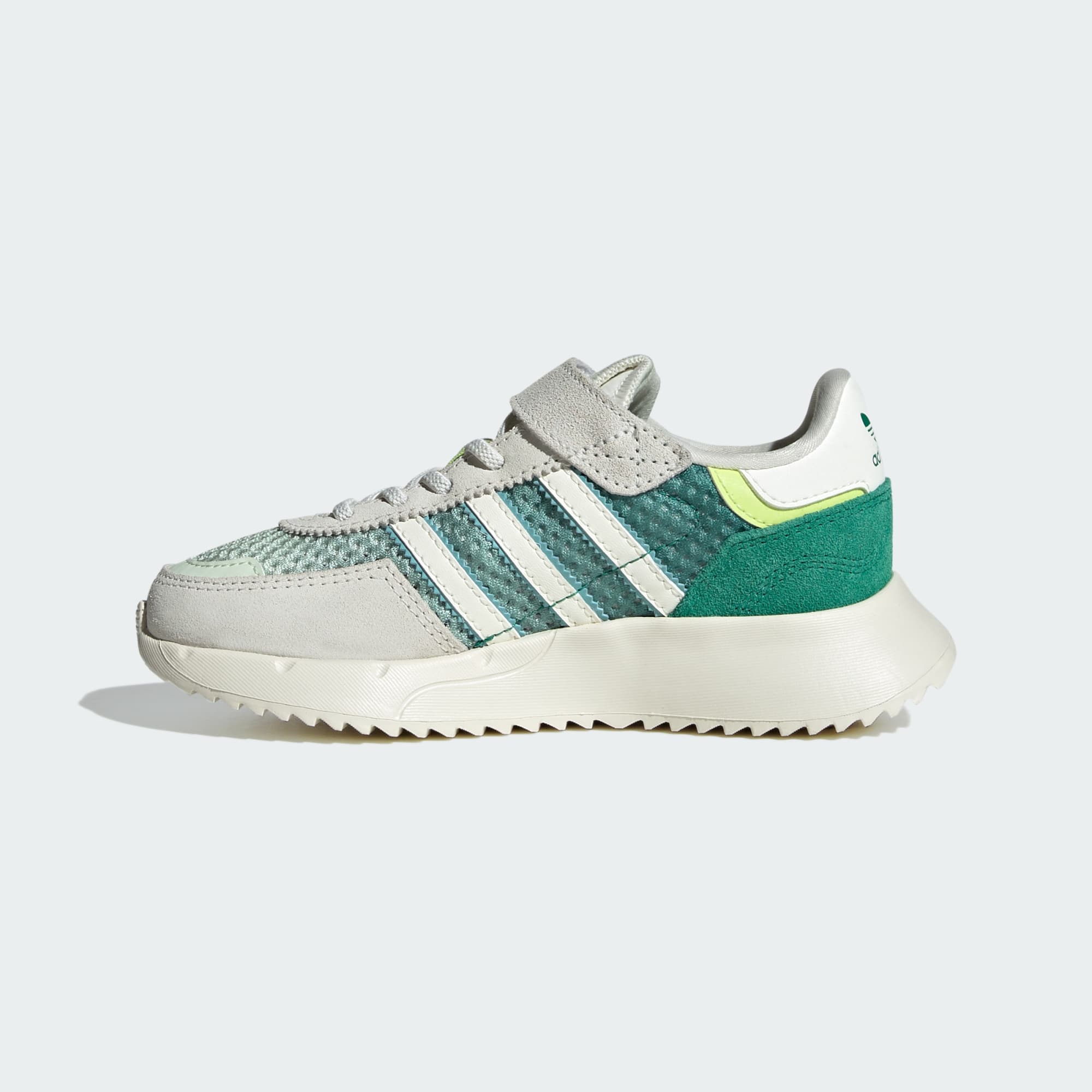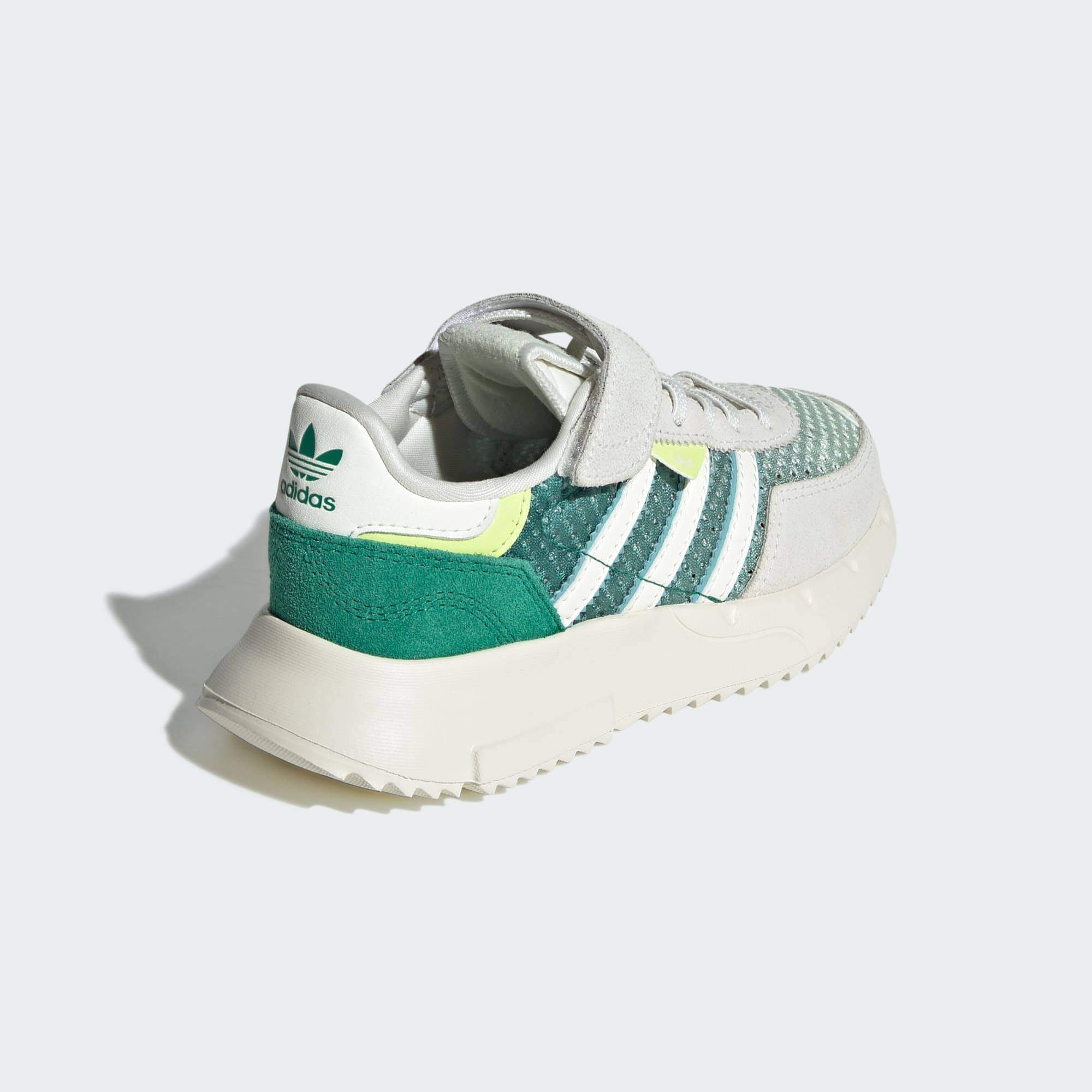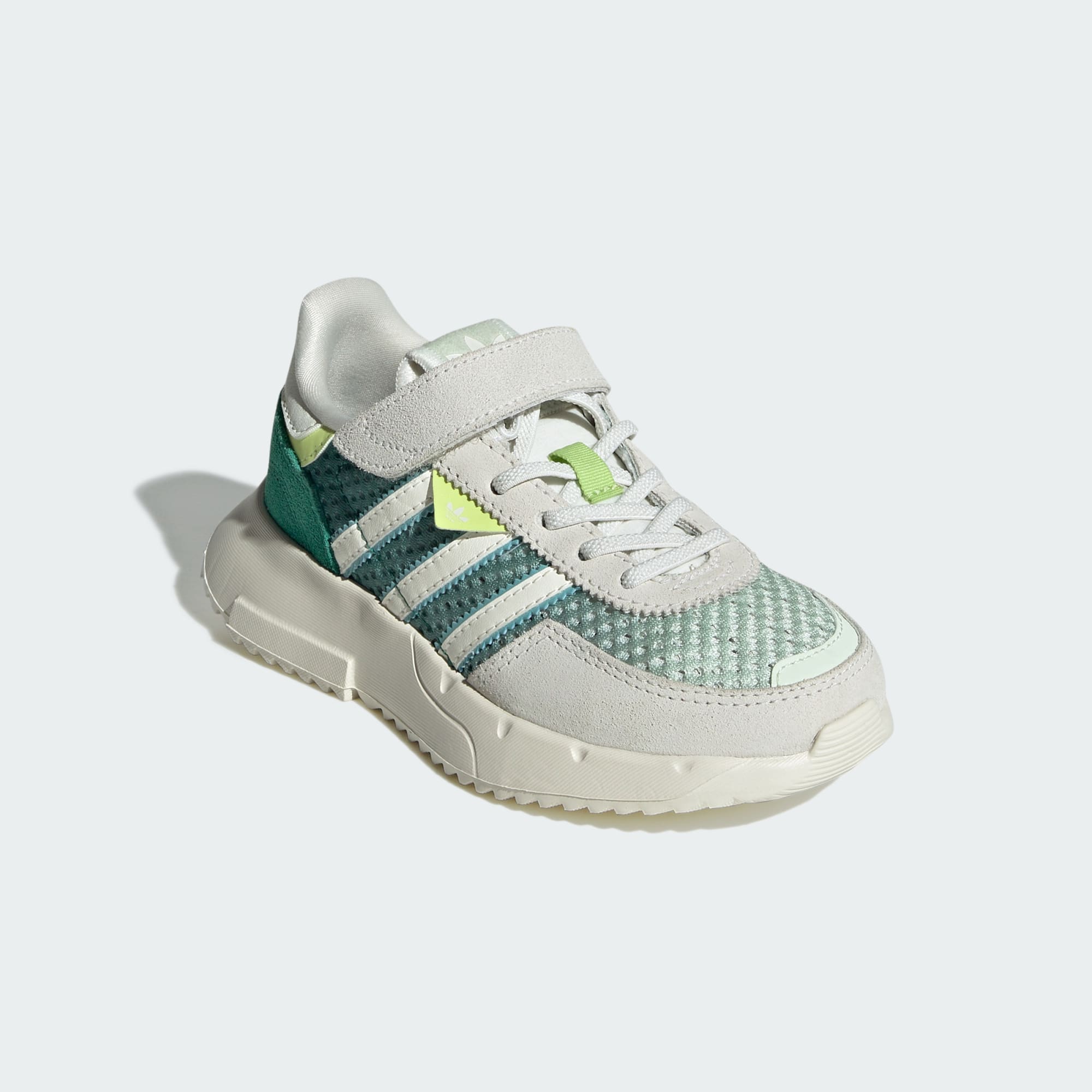 For kids on the go, the Retropy F2 shoes keep up with fast-paced adventures. A textile upper flexes with every step while hook-and-loop straps make slipping them on and off a cinch. A padded textile lining and a rubber outsole work together to cushion energetic feet during play.