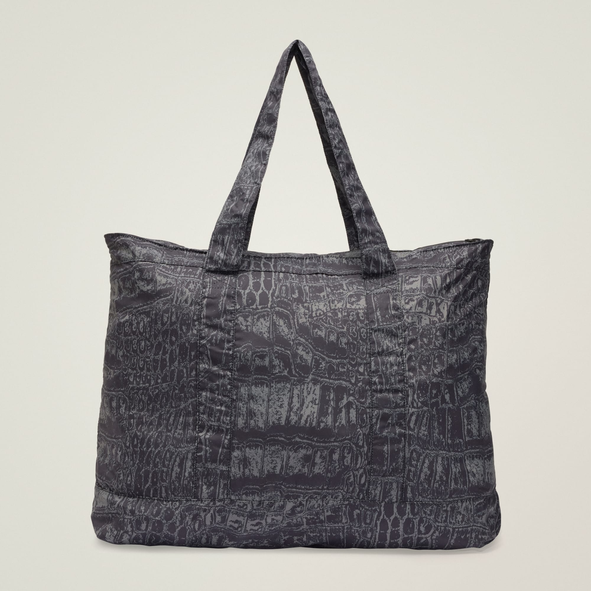 Składana torba typu tote z delikatnie błyszczącym nadrukiem przypominającym skórę krokodyla.