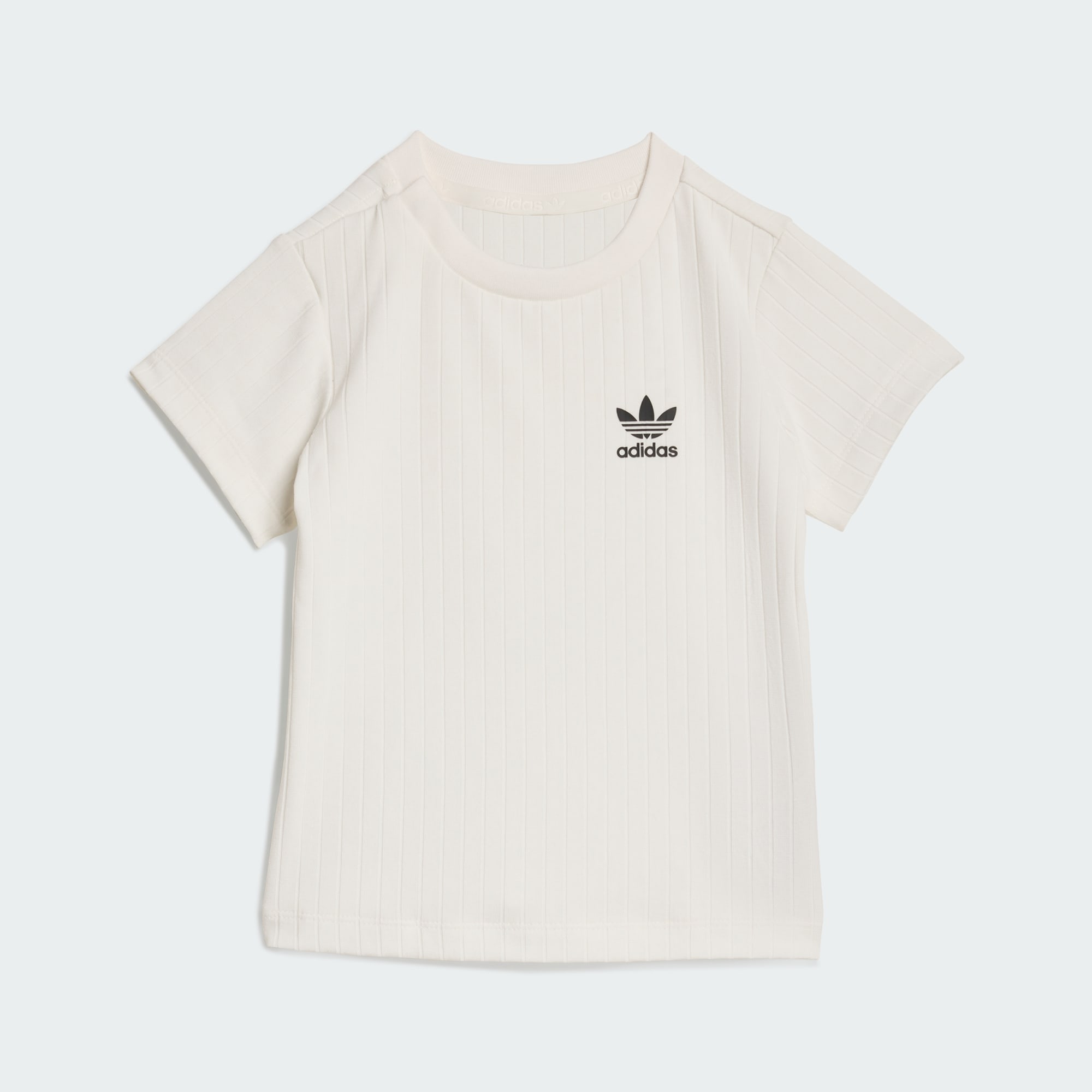 Zestaw Regular Wide Rib T-Shirt został stworzony dla najmłodszych. Koszulka i szorty łączą świetny styl oraz wygodę, dzięki czemu sprawdzą się świetnie na co dzień i zapewnią małym sportowcom wsparcie na każdym kroku. Są uszyte z wytrzymałej i miękkiej w dotyku dzianiny, mają standardowy krój i są wyposażone w ściągacz dla lepszego dopasowania. Sznurek w szortach zapewnia wygodę i swobodę ruchów podczas aktywnej zabawy, a także ułatwia zakładanie i zdejmowanie, gdy konieczna jest szybka zmiana. Zadbaj o wygodę malca, zarówno w przedszkolu, jak i podczas rodzinnych wyjść. Okrągły dekolt dodaje koszulce klasycznego charakteru, a nadruk z logo o dużej gęstości z lewej strony na klatce piersiowej i na lewej nogawce podkreśla jakość i wydajność adidas. Dla rodziców poszukujących praktycznej, ale stylowej odzieży dla maluchów ten zestaw adidas składający się z koszulki i szortów będzie niezawodnym i wszechstronnym wyborem, który wytrzyma nawet najbardziej żywiołową zabawę.